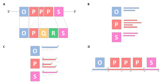 Graphical representation of BKTyper NCCR block identification using BKPyV Dunlop strain (V01108.1). Subpanels (A) to (D) represent the different steps of the algorithm. (A) Alignment of the query sequence (upper blocks) to the BKTyper NCCR archive sequences (bottom blocks). (B) Collection of alignment hits (small rectangles) by block. Alignment hits can represent (i) off-target hits or (ii) sub-alignments (as displayed by arbitrary rectangles in subpanel (B). (C) Alignment hit filtering by similarity and alignment coordinates. (D) Reconstruction of the original sequence and typing reporting. NCCR regions are codified as blue for O, red for P, yellow for Q, green for R, and purple for S blocks.