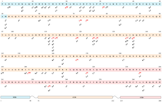 Frequency of naturally occurring polymorphisms of the A6 sub-subtype. The reference sequence (HXB2 HIV-1 clade B) is shown in the top line. Letters and numbers below each position are the polymorphisms and their frequency (%). Highly polymorphic mutations (more than 50% in A6-sequences) are indicated in red. The N-terminal domain (NTD) is indicated in blue at positions 1–50, the catalytic core domain (CCD) is indicated in orange at positions 51–212 and the C-terminal domain (CTD) is indicated in pink at positions 213–288.