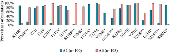 Prevalence of integrase highly polymorphic mutations in A1 and A6 viral clades from treatment-naïve patients. The statistically significant differences (p < 0.05) between A1 and A6 are indicated by *, and the unique A6 polymorphic mutations are indicated by **.