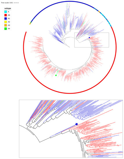 The maximum likelihood (ML) tree of the pol region sequences of subtype A included 723 tips of clade A6 and 394 tips of the other subtype A (A, A1, A2, A3, and A4). Subtypes are displayed on the outside of the tree (colored ring). Branches are colored according to the status of the 74 codon in the sequences: Blue, red, green, and yellow for sequences with L74L, L74I, L74M, and L74V, respectively. The blue star indicates A6.IT.2002.60000. EU861977 and A6.RU.2000.RU00051. EF545108 sequences. The green star indicates the cluster of viruses with the L74M mutation.