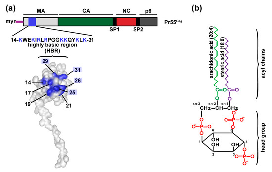 - Chukkapalli, V.; Hogue, I.B.; Boyko, V.; Hu, W.S.; Ono, A. Interaction between the human immunodeficiency virus type 1 Gag matrix domain and phosphatidylinositol-(4,5)-bisphosphate is essential for efficient gag membrane binding. J. Virol. 2008, 82, 2405–2417. [Google Scholar] [CrossRef]