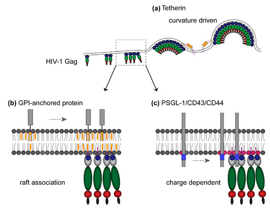 - Grover, J.R.; Llewellyn, G.N.; Soheilian, F.; Nagashima, K.; Veatch, S.L.; Ono, A. Roles played by capsid-dependent induction of membrane curvature and Gag-ESCRT interactions in tetherin recruitment to HIV-1 assembly sites. J. Virol. 2013, 87, 4650–4664. [Google Scholar] [CrossRef]