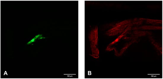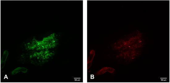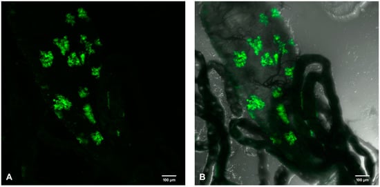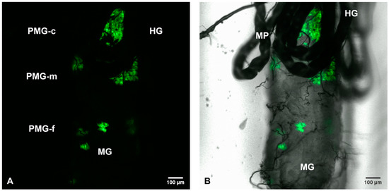 Female Ae. aegypti mosquitoes were challenged with a viremic bloodmeal at days 5–7 post-emergence. Whole-mount MGs were resected into glass-bottomed cell culture dishes and observed for SINV-associated GFP fluorescence via an Olympus laser scanning confocal microscope. GFP infection foci were clearly and distinctly visible in all three regions of the PMG (Figure 1A,B).