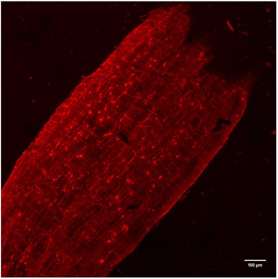 Morphological evidence of enterocytes and ECs surrounding the MG lumen were observed in cross-section of the mosquito MG monolayer (Figure 2A,B). This organ was lined with microvilli on the apical aspect, enveloped with a basal lamina surrounding lighter-stained enterocytes interspersed with darker-stained ECs. ECs appear conical, with a flask-like shape communicating with apical or basal or both aspects of the MG. This morphology of ECs reflects reports [23,26] of ECs located in PMG. Antibody against FMRFamide was used for the detection of ECs positive for FMRFamide in the mosquito PMG and visualized via a secondary antibody conjugated with TX-Red fluorochrome (Figure 3). Spatial distribution of ECs was observed along the entire length of the PMG.