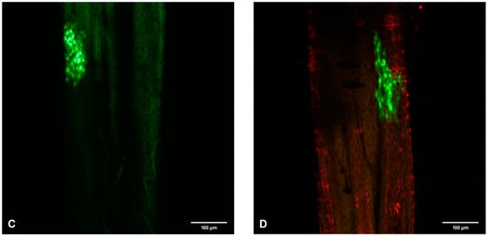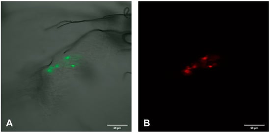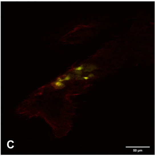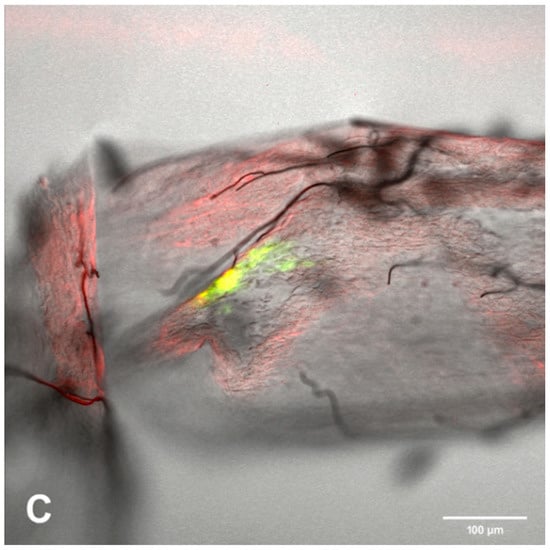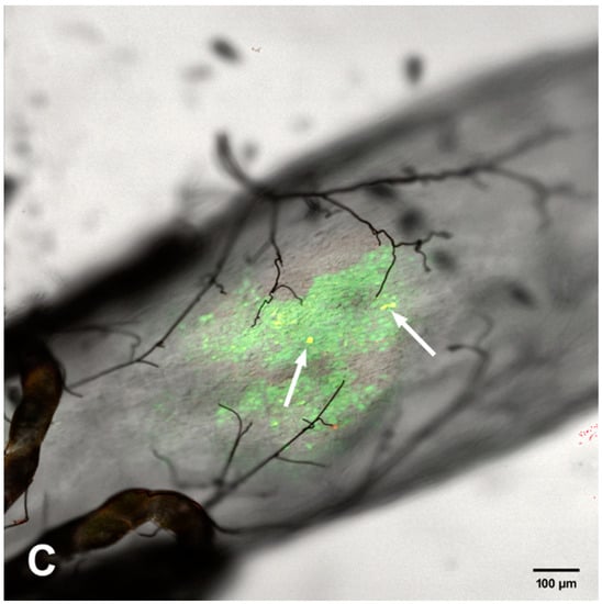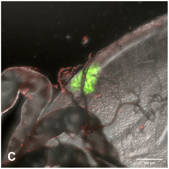 Female Ae. aegypti were blood-fed with SINV-TaV-GFP bloodmeals, followed by the identification of ECs positive for FMRFamide-TX-Red labeling (Figure 4A). GFP accumulations sequestered in gut cells were evident at day 5 p.i. forming a single infection focus in the epithelia of the PMG-m, observed in two different rotated views (Figure 4B,C). Overlay of the GFP accumulations (Figure 4B) with FMRFamide-TX-Red positive ECs (Figure 4A) results in a merged image (Figure 4D), which demonstrated that colocalization of arbovirus and ECs was not observed at day 5 p.i. At day 5 p.i., a total of 60 mosquitoes imbibed viremic blood, virus foci were identified in 4 mosquitoes (~7% infection) and colocalization with ECs was absent.