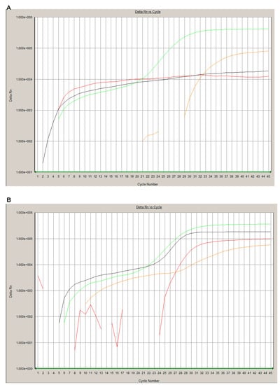 Examples for a positive and negative rRT-PCR result. A SARS-CoV-2 negative sample ((A); ID 17) show a signal in the control RNA specific HEX channel (orange line) and process control channel ROX channel (green line). A SARS-CoV-2 positive sample ((B); ID 5) shows additionally a SARS-CoV-2 specific amplification in the FAM channel (red line) and beta-Coronavirus detection (E gene) in the Cy5 channel (black line).