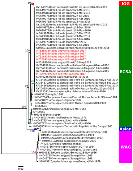 - Costa-da-Silva, A.L.; Ioshino, R.S.; Petersen, V.; Lima, A.F.; Cunha, M.d.P.; Wiley, M.R.; Ladner, J.T.; Prieto, K.; Palacios, G.; Costa, D.D.; et al. First report of naturally infected Aedes aegypti with chikungunya virus genotype ECSA in the Americas. PLoS Negl. Trop. Dis. 2017, 11, e0005630. [Google Scholar] [CrossRef]