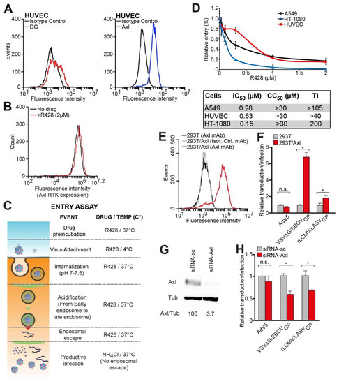 To further validate the participation of Axl RTK during the early steps of rLCMV/LASVGP infection, we administered R428 before, during, and after viral infection (time-of-addition assay, Figure 2A).