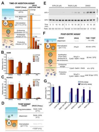 Axl RTK participates only in early steps of rLCMV/LASVGP entry. (A) Schematic experimental setting of the time-of-addition assay. R428, 5-(N-ethyl-N-isopropyl)-amiloride (EIPA), or ribavirin (Rib) were added at the indicated times relative to infection. Ammonium chloride (20 mM) was added 1 h after infection (+1 hpi) to prevent reinfections; (B,C) Inhibition of rLCMV/LASVGP infection in time-of-addition assays by R428 (0.5 µM), EIPA (20 µM), and Rib (100 µM) in A549 (B), and HUVEC cells (C); (D) Schematic experimental setting of the TCEP assay to monitor virus internalization, (E) Viral uptake in the presence of EIPA and R428 in A549 cells. After quenching of residual TCEP, cells were lysed, and viral GP isolated by IP with mAb 83.6 to LCMV GP2. Biotinylated GP2 was detected with streptavidine-HRP in Western blot under non-reducing conditions using enhanced chemiluminescence (ECL). The upper blot (+TCEP) was exposed for 5 min and the lower blot (−TCEP) for 30 s. Ratios of +TCEP/−TCEP signals (densitometry) were calculated using ImageJ software; (F) Schematic experimental setting of the post-entry assay; (G) Relative entry of rLCMV/LASVGP in entry and post-entry assays in the presence of CytoD, BafA1, or R428. Values were normalized with those obtained in the presence of dimethyl sulfoxide (DMSO). Error bars represent standard deviations (n = 3).