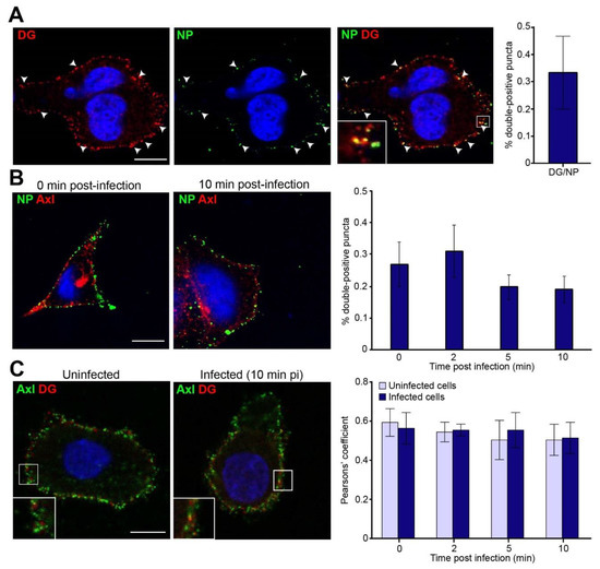 Our findings provided evidence for Axl RTK participation in LASV entry in the presence or absence of fully functional DG. Therefore, we investigated a possible clustering of LASV with DG or Axl RTK during viral entry. Using confocal microscopy, in agreement with previous reports, we found that rLCMV/LASVGP attached preferentially to DG clusters at the plasma membrane, which could serve as “docking sites” for free virus (Figure 3A). Nevertheless, rLCMV/LASVGP and Axl RTK colocalization did not increase over time upon viral infection (Figure 3B). Contrary to the spotted pattern observed in DG, it is noteworthy that Axl RTK signal was diffuse and extended along the viral membrane, rendering comparisons between DG/NP and Axl RTK/NP colocalizations challenging. Then, we sought to investigate if LASV could induce transient DG-Axl RTK clustering during viral entry. The results showed no differences in colocalization of DG and Axl as comparing with uninfected and with infected cells at different time points after infection (Figure 3C).