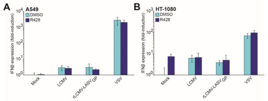 Axl RTK participates in infection of several RNA viruses [48,51,52,93]. Interestingly, Axl signaling seems to contribute to virus internalization, and can also promotes later steps of viral multiplication [51,52,93]. Virus-induced activation of Axl RTK can promote replication by antagonizing IFN-I signaling, as illustrated by the flaviviruses dengue, West Nile, and Zika [52,93,94]. To address whether or not the observed contribution of Axl RTK to LASV increased entry was mediated by suppression or the IFN-I response, we performed infections in the absence or presence of R428 in immunocompetent A549 cells and monitored IFNβ mRNA levels, at 16 h post infection. The results showed that the presence of R428 did not affect IFNβ expression triggered by infection with LCMV, rLCMV-LASVGP, or VSV (Figure 4A and Figure S3).