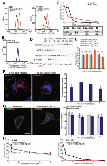 HGFR is a RTK that is implicated in the entry of LASV and other viruses into human epithelial cells [27,59]; however, its exact role during viral entry is currently unknown. To extend our previous studies, we determined the contribution of HGFR to LASV cell entry. We compared rLCMV/LASVGP infections in A549 cells, which express Axl and HGFR RTKs in the context of functional DG, with infections in HT-1080 cells, which likewise express Axl and HGFR RTKs but lack functional glycosylated DG (Figure S1A,B and Figure 5A). As described for the entry assay (Figure 1C), we preincubated A549 and HT-1080 cells, for 30 min, at 37 °C, with increasing concentrations of EMD which is a potent HGFR kinase inhibitor with an IC50 of 3 nM [65], which did not affect HGFR expression (Figure 5B). Then, cells were cooled down to 4 °C, infected with rLCMV-LASVGP in the presence of the drug, and shifted to 37 °C, for 1 h. The results showed that inhibition of HGFR by EMD reduced rLCMV/LASVGP entry in a dose-dependent manner in both A549 cells (IC50 = 8.5 µM and CC50 > 90 µM) and HT-1080 cells (IC50 = 3.7 µM and CC50 > 90 µM) (Figure 5C and Figure S4A), in the absence of overall cytotoxicity (Figure S2B).