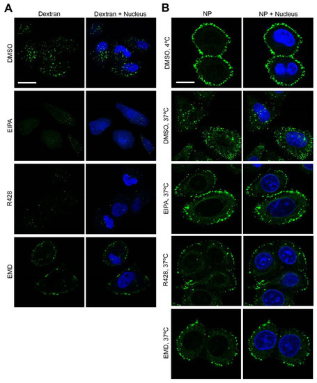 A549 cells were seeded onto sterile 12 mm glass cover slips at a density of 7 × 104 cells/well, incubated for 24 h and treated for 30 min with the indicated inhibitors, and subsequently, with Dextran, Alexa FluorTM 488 (10 kDa) at 0.25 mg/mL for an additional 40 min, at 37 °C. Cells were washed twice, fixed with 2% v/v PFA, and stained with NucBlueTM to visualize the nucleus. After mounting with Mowiol, cells were directly analyzed by confocal microscopy. Viral NP and Dextran, Alexa FluorTM 488 colocalization was measured, as described in [78].