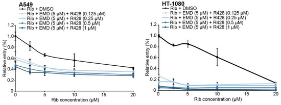 Antiviral effect of R428, EMD, and Rib cocktails. A549 and HT-1080 cells were pretreated for 30 min, at 37 °C, cooled down to 4 °C, and infected with rLCMV/LASVGP in the presence of indicated concentrations of Rib, either in combination with DMSO or EMD (10 µM) and R428 (0–1 µM). Then, cells were moved to 37 °C, for 1 h. Upon infection, cells were incubated for 16–20 h in the presence of indicated drugs and 20 mM of ammonium chloride. Relative entry values were normalized to the infectivity in absence of any drug. Error bars represent standard deviations (n = 3).