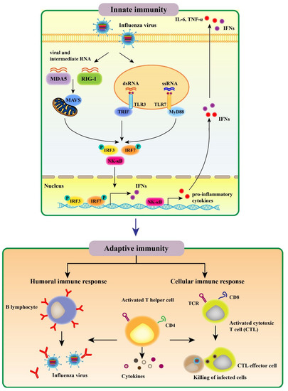 The innate immune response constitutes the first line of protection from invading pathogens. AIV infection results in a recognition of viral conserved components called pathogen associated molecular patterns (PAMPs) by host pathogen recognition receptors (PRRs), including Toll-like receptors (TLRs), retinoic acid inducible gene-I (RIG-I) receptors (RLRs), and NOD-like receptors (NLRs); the above recognition subsequently activates innate immune signaling and induces various proinflammatory cytokines as well as antiviral molecules [18,19]. Then, activation of the initial innate immune response regulates the adaptive immune system (Figure 1).