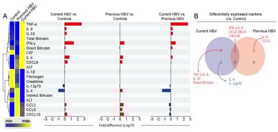 Systemic inflammatory profile of the study population. (A) Left panel: A hierarchical cluster analysis (Ward’s method) was employed to describe the overall expression pattern of plasma biomarkers in the study population. Dendrograms represent Euclidean distance. Right panel: Fold-differences in plasma levels of the indicated biomarkers between the study groups. Differences that reached statistical significance after adjustment for multiple comparisons (adjusted p < 0.05) are represented in colored bars. (B) Venn diagram demonstrates markers whose values were statistically different between each hepatitis B virus (HBV) group (current or previous infected) and healthy controls. Abbreviations (alphabetic order): ALT: alanine aminotransferase; AST: aspartate aminotransferase; CCL: C-C motif chemokine ligand; CXCL: C-X-C motif chemokine ligand; CRP: C-reactive protein; IFN: interferon; IL: interleukin; TNF: tumor necrosis factor.