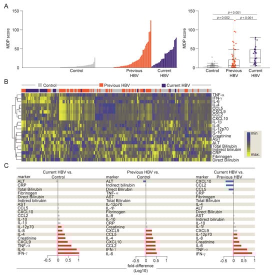 Higher degree of inflammatory perturbation associated with HBV infection. (A) Left panel: Histograms show the molecular degree of perturbation (MDP) score values relative to each study group, as indicated. Right panel: Box plots represent the MDP score distribution between study groups. Values were compared between patient groups using the Kruskal–Wallis test. (B) A hierarchical cluster analysis (Ward’s method) was employed to show the molecular degree of perturbation of each individual biochemical marker. (C) Average fold-difference values of the MDP scores for each marker were calculated between clinical groups. Red and blue bars represent statistically significant differences estimated by the Mann–Whitney U test. Abbreviations (alphabetic order): ALT: alanine aminotransferase; AST: aspartate aminotransferase; CCL: C-C motif chemokine ligand; CXCL: C-X-C motif chemokine ligand; CRP: C-reactive protein; IFN: interferon; IL: interleukin; TNF: tumor necrosis factor.