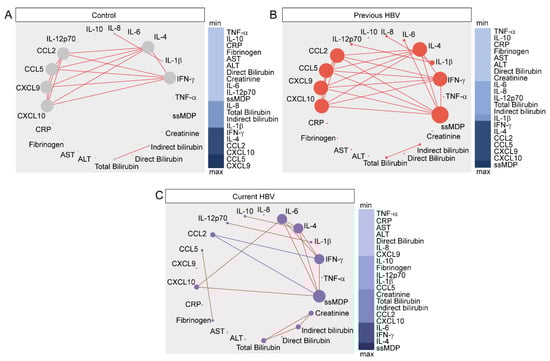 Network analysis of the MDP score matrices in the study groups. Spearman correlation matrices of the MDP score values in each study group ((A) controls; (B) previous HBV; (C) current HBV) were built and Circos plots were used to illustrate the correlation networks. Only significant correlations (p < 0.05) are shown. Each circle represents a different plasma parameter and the size of each circle is proportional to the number of significant correlations. Lines represent the Spearman rank (rho) values. Red color infers positive correlation, whereas blue color denotes negative correlation. Node analysis heatmap shows the number of statistically significant correlations involving each marker per clinical group. Abbreviations (alphabetic order): ALT: alanine aminotransferase; AST: aspartate aminotransferase; CCL: C-C motif chemokine ligand; CXCL: C-X-C motif chemokine ligand; CRP: C-reactive protein; IFN: interferon; IL: interleukin; TNF: tumor necrosis factor.