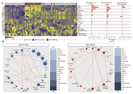 Spearman correlation matrices (Figure 4B) demonstrated that, in comparison with HBeAg+ patients, anti-HBe+ subjects had a greater number of significant correlations between the analyzed biomarkers. These correlations were predominantly positive as well. The top node in the correlation matrix from the group of anti-HBe+ patients was IFN-γ, which presented negative interactions with CRP, IL-12p70, and IL-1β, and positive correlations with IL-4 and IL-6. The following top node was IL-4, which presented negative correlations with CCL2 and IL-1β, and positive interactions with IL-6, IFN-β, and ALT. Of note, ssMDP score values were correlated only with TNF-α and fibrinogen in these patients. When the correlation profile of HBeAg+ patients was analyzed, the top connected node was IL-6, which presented positive correlations with CCL5, CXCL10, and AST. The following top node was indirect bilirubin, which presented negative correlations with IL-8 and direct bilirubin, and positive connection only with total bilirubin. In these patients, IL-4 presented positive significant correlations with IFN-γ and IL-10 and was negatively correlated to creatinine. The next top connected node was total bilirubin, which presented positive correlation with ssMDP and indirect bilirubin, as previously mentioned, and negative interaction with IL-8. These findings suggest that HBV replication, although not representing a huge impact on the systemic inflammatory imbalance, could lead to an uncoupling in the overall inflammatory response, translated by the detection of fewer connections in the correlation networks. These observations could also infer that the disease activity after the control of viral replication is mainly immune-driven.