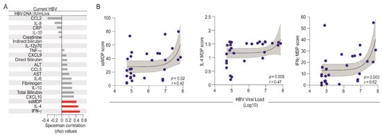 Finally, we performed an additional Spearman correlation analysis to directly evaluate the associations between the HBV-DNA viral loads and the degree of inflammatory perturbation in HBV chronic carriers (Figure 5). We found that the HBV viral load was directly associated with ssMDP score values (r = 0.42; p = 0.02) as well as with the degree of perturbation of IL-4 (r = 0.47; p = 0.009) and IFN-γ (r = 0.52; p = 0.003) levels in plasma (Figure 5A,B). These findings identified the specific markers that were influenced by HBV viremia.