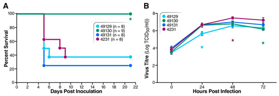 3.2. EV-D68 Strains Showed Differential Virulence in Tg21/IFNR-ko Mice