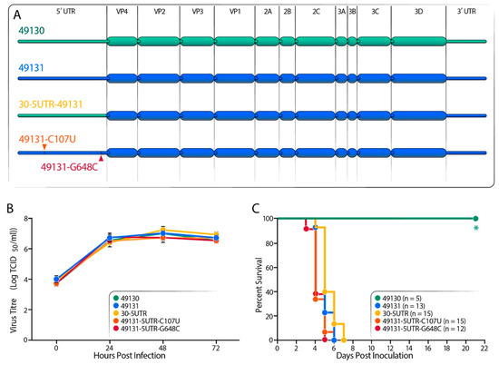 3.3. Nucleotide Changes in the 5′-UTR Are Not Involved in EV-D68 Virulence