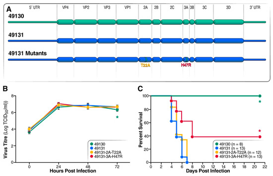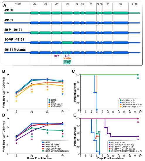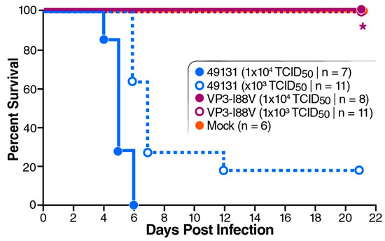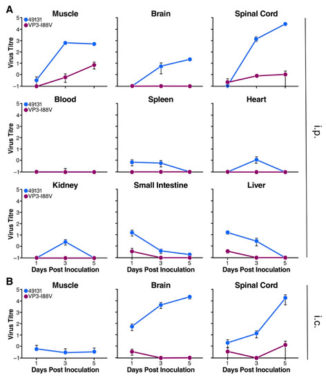 3.5. VP3-I88V Reduced Virus Replication in Mice