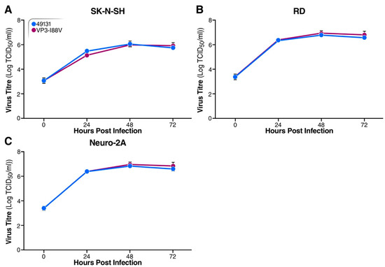 3.6. EV-D68 49131 and VP3-I88V Mutant Virus Showed Comparable Replication Ability in Cell Lines