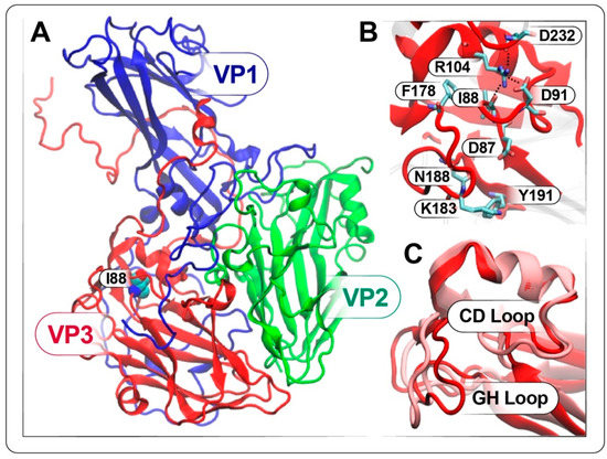 3.7. Comparison of the Simulated Capsid Structures of EV-D68 VP3 and the VP3-I88V Mutant