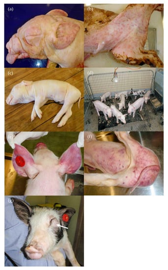 The exposure of the pregnant animals at around 35 days of gestation resulted in a high percentage of infected pigs that were seronegative (96%) and presumably persistently infected at birth []. Clinically, a high proportion of stillborn (24%) and mummified pigs (18%) and a very high level of preweaning mortalities (70%) resulted (Table 1). The live-born pigs in these litters were often very weak, had difficulties moving from the rear of the sow after birth and some showed a limited ability to suckle. Many died soon after birth or were overlain, presumably as a consequence of their weakness or were euthanased due to their inability to feed. Additional abnormalities observed at birth in both stillborn and live-born pigs included purpura extending over the skin (n = 15) (Figure 1a,b) and/or subcutaneous oedema, particularly extending over the head, neck and ventral abdomen (n = 9) (Figure 1c). Pigs born with subcutaneous oedema had poor viability. All nine died soon after birth, were weak and were overlain or were euthanased on humane grounds within 3 days of birth. Mild subcutaneous oedema was noted in an additional two pigs at necropsy at 3 and 11 days of age. Of the four pigs with purpura that survived to be weaned, the purpura resolved with age and three of the four appeared to grow normally until weaning, although two developed conjunctivitis at approximately 3 weeks of age. They subsequently died or were euthanased when 26, 34, 35 and 57 days old. Several pigs exhibited neurological signs at birth, including walking into walls (14-04) and screaming, due to an inability to find the udder despite being able to suckle (most of litter 12). One pig (14-04) also developed haemorrhagic diarrhoea in the first week of life that resolved following antibiotic treatment. Three pigs developed diarrhoea in the first week of life, two of which were cross-fostered from their original mother due to milk supply issues, presumably due to poor udder stimulation from weak piglets and were ultimately euthanased (12-02, 12-05) by 2 weeks of age, and a third that had diarrhoea for 3–4 days that resolved following antibiotic treatment and then died suddenly 6 days later (16-02). One 2-week-old pig was euthanased as it failed to grow.