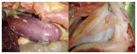 Necropsy findings from D35: (a) petechiation of a kidney (17-03—same pig as Figure 1e,f) and (b) ulcerated tonsil (16-07).