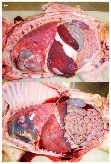 Necropsy findings from D90: (a) cardiac and hepatic enlargement (20-06; 7 days old) and (b) free blood in the unopened pericardial sac (arrow) and abdomen (19-02; 12 days old).