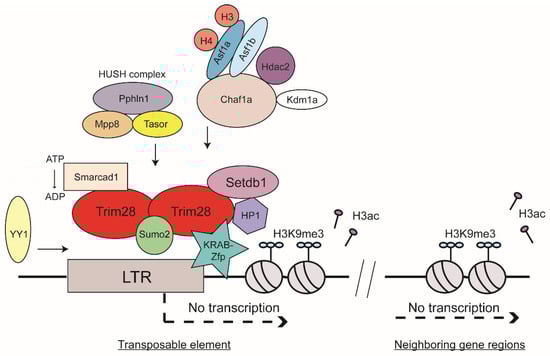 Sequence-specific DNA binding by the KRAB-Zfps is mediated through the zinc fingers themselves, whereas the KRAB domain recruits corepressors and other chromatin modifiers to induce transcriptional suppression. Most KRAB-Zfps interact with Trim28 [53]. An example of a prominent KRAB-Zpf that binds Trim28 is Zfp809, which binds specifically to the tRNA proline PBS of MLV and mediates silencing of both exogenous and endogenous viral expression in mouse ESCs [56,57,58]. Another example is the product of the sgp3 gene, which similarly binds specifically to the tRNA glutamine PBS of endogenous MLVs and mediates their silencing in various mouse strains [59]. A novel recently discovered KRAB-Zfp is Zfp708, which also recruits Trim28. Zfp708 specifically binds a member of the ERV-K family and is shown to play an important role during embryonic development through regional formation of epigenetic marks of heterochromatin during epigenetic reprogramming [60]. Another example is the Zfp Yin Yang 1 (YY1), which binds to the LTR-region of many retroviruses, both exogenous and endogenous, and thereby induces silencing by recruitment of Trim28 and its downstream machinery (Figure 2) [61,62,63,64,65]. Importantly, Trim28 was shown to co-localize with heterochromatin protein 1 (HP1) [66], another important key player in heterochromatin formation. It has been shown that the methylation of H3K9 forms a binding site with high affinity for HP1 and therefore the H3K9me3 mark itself recruits HP1 proteins efficiently [67,68,69,70]. Trim28, Setdb1, H3K9me3, and HP1 were all found to be enriched at promoter sequences of genes silenced by the KRAB-Zfp and Trim28 complex (Figure 2) [43]. Trim28 knock-out leads to upregulation of several ERV classes (e.g., IAP and MERV-L [45]). Furthermore, a knock-down of Trim28 led to activation of genes in near proximity to ERVs [71,72].