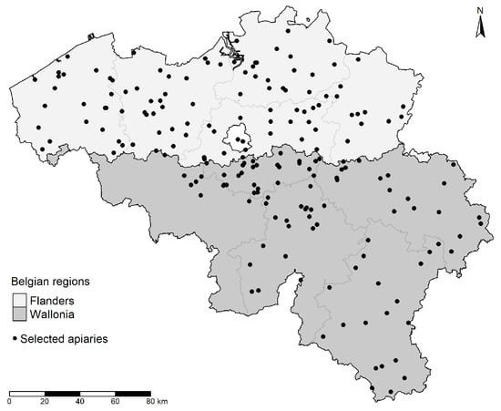 Map of Belgium and its provinces showing the locations of the selected apiaries (black dots). Provinces in Flanders in light grey, provinces of Wallonia in dark grey.