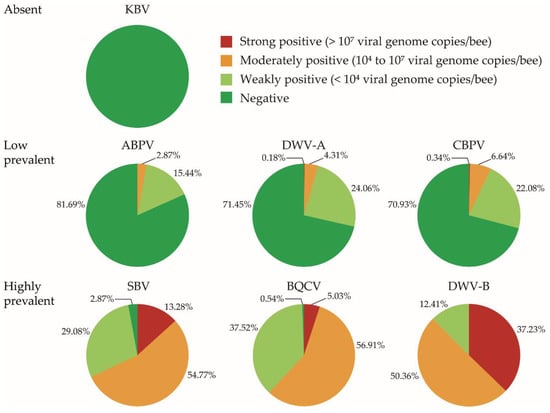 Although the prevalence of viruses was high among these Belgian honey bees, it is important to note that most of the colonies were only weakly or moderately positive for a virus (see Figure 2), so it cannot be deduced that these viruses have a strong impact on bee health. High viral loads for one or several viruses were however found in about 46% of the colonies. Although colonies displaying clinical signs usually have high viral loads, a high viral load does not necessarily result in clinical signs. Thresholds between 105 and 1010 viral genome copies per bee have been suggested for different honey bee viruses to distinguish between covert and overt infections, but not all colonies with a viral load above the defined thresholds in these studies displayed clinical signs [34,36,50]. This is especially the case for DWV-B, where 45% of the colonies with a viral load above the defined threshold did not display clinical signs [34]. The appearance of clinical signs depends on many factors. Sometimes the occurrence of some clinical signs can be “hidden” by the hygienic behavior of the bees, when larvae or pupae with disease symptoms are removed from the colony [34]. The virulence of honey bee viruses is also influenced by the transmission route or type of tissue or life-stage that becomes infected [12]. On the other hand, even covert infections can still influence honey bee survival, and several viruses have been linked with overwintering colony mortality even in the absence of (visible) clinical signs [51,52,53].