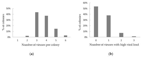 All screened colonies were infected with at least two viruses (Figure 3a). Twelve colonies were infected with only two viruses, 11 of these with DWV-B and BQCV. In almost half of the colonies (43.27%), three different viruses were detected, most often DWV-B, BQCV and SBV (236 out of 241 colonies). Sixteen colonies (2.87%) were infected with six different viruses. However, in more than half of all colonies (53.5%), only infections with low viral RNA loads were detected (Figure 3b). The maximum number of viruses with a high viral load found in one colony was 3 (in 7 colonies, each time BQCV, DWV-B and SBV).