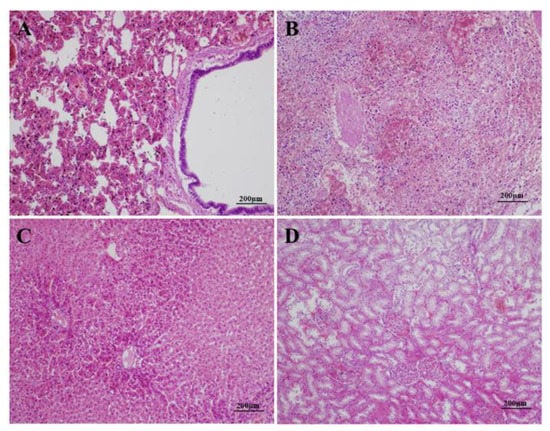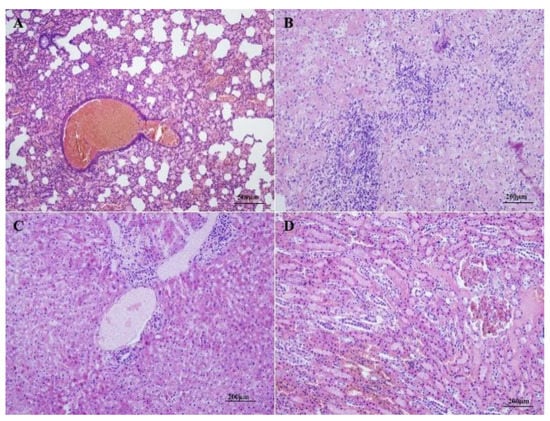 Histopathological lesions observed in diseased Alpine musk deer. Lung (A): moderate, diffuse congestion in alveolar capillary and blood vessels, extensive hemosiderin deposition, and dilation of bronchioles; liver (B): vacuolar degeneration of hepatocytes in the central zone of the lobule, karyopyknosis and karyolysis in some hepatocytes, and mild sinusoidal dilation and congestion; spleen (C): disorganization of the splenic architecture, extensive necrosis and atrophy of the white pulp with severe lymphocyte depletion, and moderate hemorrhage in the parenchyma; kidney (D): congestion of interstitial blood vessels, microthrombosis in the glomerular capillaries, and degeneration and karyopyknosis in numerous tubular epithelial cells. (H&E, 100×).