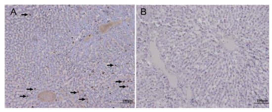 Detection of RHDV VP60 signals in the livers of the dead Alpine musk deer by immunohistochemistry. Incubation with the primary antibodies against VP60 (A), positive signals are indicated by arrow; incubation without the primary antibody as the control (B).