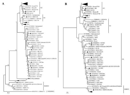 To analyze the phylogeny of GS/YZ, we constructed neighbor-joining trees based on the nucleotide sequences of the whole genome and VP60 of GS/YZ and the reference RHDV strains (n = 85). In the whole genome tree (Figure 5A), the new Alpine musk deer strain GS/YZ was clustered within the genogroup G2, showing the closest evolutionary relationships with RHDV strains Chinese HB (KY437668.1), Korea/2719 (KY235678.1), Mexico/2718 (KY235677.1), and Mexico89 (AF295785.1). This phylogeny of the virus was strongly supported by the VP60 tree (Figure 5B), in which the new strain showed almost the same phylogenetic topology as that of the genome tree, indicating that GS/YZ is a G2 RHDV virus, showing close evolutionary relationships with the rabbit isolates.