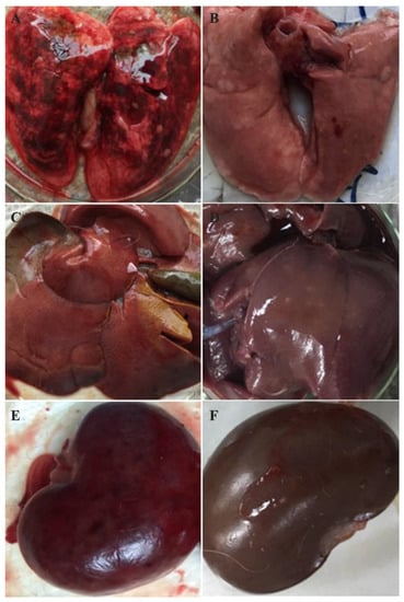 Macroscopic signs observed in rabbits inoculated with the RHDV strain GS/YZ. Lung (A): pulmonary hyperemia, and carnification. Liver (C): friable, fatty, and discolored liver. Kidney (E): necrotic foci on the kidney. The lung (B), liver (D), and kidney (F) of uninfected rabbits.