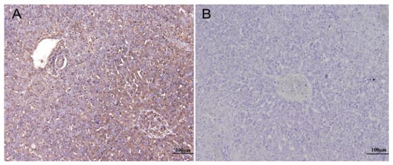 Detection of RHDV VP60 signals in the livers of the rabbits inoculated with the tissue homogenates of the dead Alpine musk deer by immunohistochemistry. Incubation with the primary antibodies against VP60 (A); incubation without the primary antibody as the control (B).