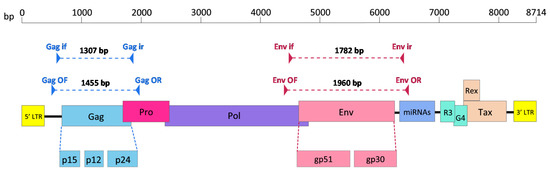 Schematic diagram showing open reading frames of the bovine leukaemia virus (BLV) genome and gag and env regions amplified using nested PCR (nPCR). Triangles denote primers and dotted lines denote amplified regions. Gag if, Gag inner forward primer; Gag ir, Gag inner reverse primer; Gag OF, Gag outer forward primer; Gag OR, Gag outer reverse primer; Env if, Env inner forward primer; Env ir, Env inner reverse primer; Env OF, Env outer forward primer; Env OR, Env outer reverse primer; Pro, protease; Pol, polymerase; Env, envelope; miRNAs, microRNAs; p15, matrix protein; p12, nucleocapsid protein; p24, capsid protein; gp51, surface protein; gp30, transmembrane protein. Adapted from Polat et al. (2017) [56].