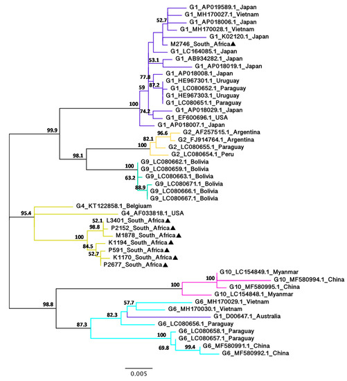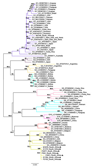 The NJ and ML trees revealed that seven of the South African isolates (K1170, K1194, M1878, P591, P2152, P2677 and L3401) are closely related to each other with 99.8% bootstrap value and all belong to G4. One South African isolate (M2746) did not cluster with the seven other South African isolates and grouped with G1. This phylogenetic analysis also indicated that the G4 South African isolates are more divergent from other G4 isolates, whereas the G1 South African isolate is less divergent from other G1 isolates. The G4 South African isolates appeared to be moderately related to a Russian isolate (JN695878.1) with 74.5% (NJ) and 75.1% (ML) bootstrap values and their estimated evolutionary divergences were 0.0132 (P2677 and P591), 0.0139 (K1170, K1194, M1878 and P2152) and 0.0153 (L3401) (Supplementary Figure S2). In contrast, the G1 South African isolate clustered with Saint Kitts and Nevis isolates (KX674367.1 and KX674370.1) with 90.5% (NJ) and 88% (ML) bootstrap values and their estimated evolutionary divergence was 0.0046 (KX674367.1) and 0.0039 (KX674370.1) (Supplementary Figure S2).
