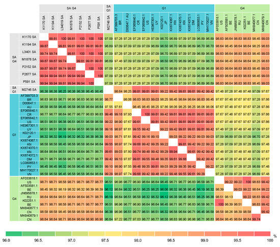 Pairwise percent identity of BLV full-length Gag nucleotide (1182 bp) and amino acid (393 amino acids) sequences between G1 and G4 isolates from South Africa and other geographic regions worldwide. The lower matrix shows the percent identity of nucleotide sequences and the upper matrix shows that of amino acid sequences. The country of origin is indicated by 2-letter country codes (see Supplementary Table S2). SA, South Africa.