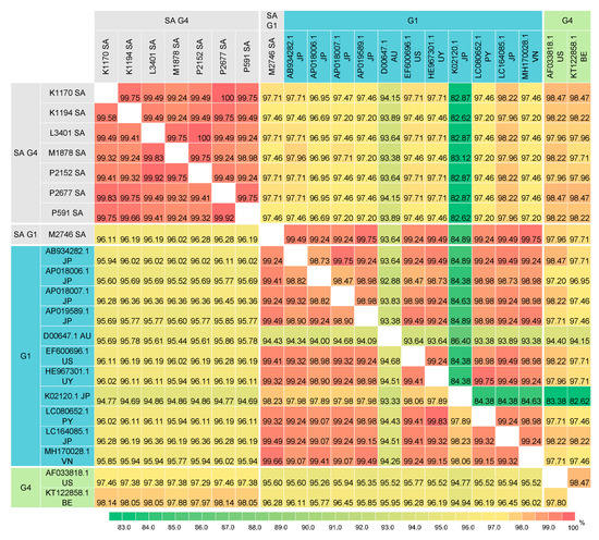 Pairwise percent identity of BLV full-length Env nucleotide (1548 bp) and amino acid (515 amino acids) sequences between G1 and G4 isolates from South Africa and other geographic regions worldwide. The lower matrix shows the percent identity of nucleotide sequences and the upper matrix shows that of amino acid sequences. The country of origin is indicated by 2-letter country codes (see Supplementary Table S2). SA, South Africa.