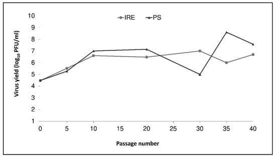 To assess the evolution of the plaque size during the passaging history, the plaque sizes in passage numbers 5, 10, 20, 30, 35, and 40 in both cell lines and in LT IRE were measured using ImageJ software (NIH, Bethesda, MD, USA, version 1.52a) [31] and compared to the 0 P plaque size. The diameters of a minimum of 20 randomly chosen discrete plaque samples per viral variant were measured in duplicate and mean value sizes were plotted and compared statistically.