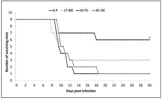 Different plaque size of variants obtained under the three different modes of propagation indicated that biological properties of such viruses could vary. To test this hypothesis, we performed a virulence assay in a mouse model. Mice were inoculated subcutaneously with 100 PFU of viral variants or parental strain. A significantly longer median survival time and lower mortality rate were observed in mice inoculated with 40 PS in comparison to 0 P-, 40 IRE-, and LT IRE-inoculated mice (Fisher’s LSD, p < 0.05). Moreover, 66% of mice survived the challenge with 40 PS, whereas only 11–33% of mice survived infection with the remaining strains (Figure 3). By challenging laboratory mice with individual TBEV variants, different virulence levels and outcomes of the disease were observed.