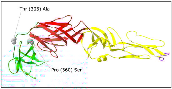 To evaluate the potential impacts of nucleotide substitutions on virulence, the locations of the alterations in the least-virulent variant 40 PS was investigated in detail. Amino acid substitutions were found in the NS2A and NS4B proteins (one substitution each) and in the NS5 and E proteins (two substitutions each). Because of several crucial functions of the E protein in the viral life cycle, mutations in this protein were analyzed more closely. The substitution Thr (305) → Ala was situated in the region connecting domain I with domain III (DI–DIII linker). The second substitution Pro (360) → Ser was placed close to the region with a probable function in binding to a cell receptor (Figure 4).