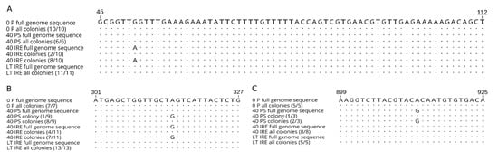 Comparison of partial nucleotide sequences of (A) 5’UTR, (B) C protein, and (C) E protein among clones derived from parental tick-borne encephalitis virus (0 P) and virus variants 40 PS, 40 IRE, and LT IRE. Numbers in parentheses represent the frequency of a particular substitution among the sequenced clones. Dots represent conserved nucleotides, letters indicate substitutions.