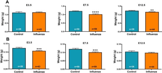 Maternal influenza reduces fetal (A) and placental (B) weights. Pregnant mice were inoculated intranasally with phosphate-buffered saline (PBS, control) or influenza at E3.5 (3 control dams; 5 influenza dams); E7.5 (8 control dams; 9 influenza dams); or E12.5 (5 control dams; 5 influenza dams). Fetuses and placentae were weighed on E18.5. Data are shown as mean ± SEM (standard error of the mean); n = number of fetuses. ** p < 0.01; *** p < 0.001; **** p < 0.0001.